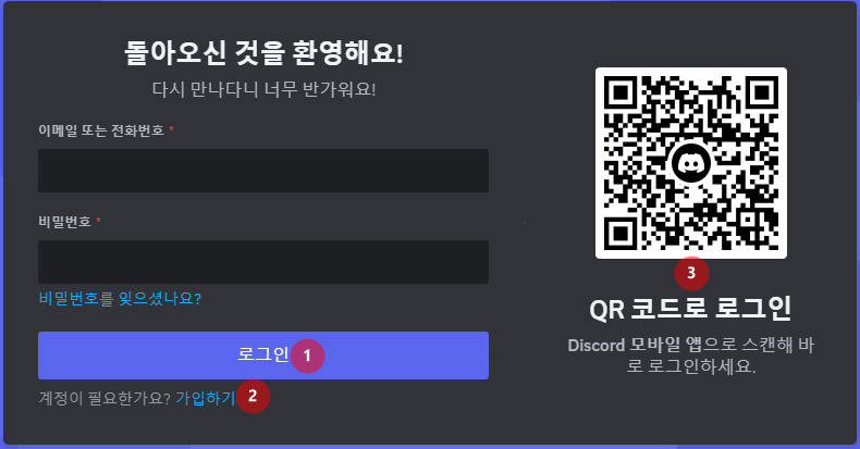 2. 디스코드를 이용한 로그인 창이 열리며 계정이 있으면 입력하고 없다면 가입하기를 진행합니다. 3번 모바일 디스코드를 이용한 QR코드 로그인도 가능합니다.