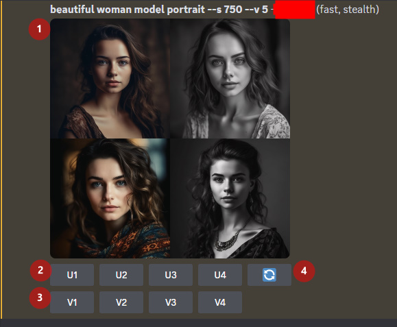 간단하게 portrait of beautiful model이라고 입력해 보겠습니다. 1분 정도 기다리니 이미지 4장이 준비가 되었네요