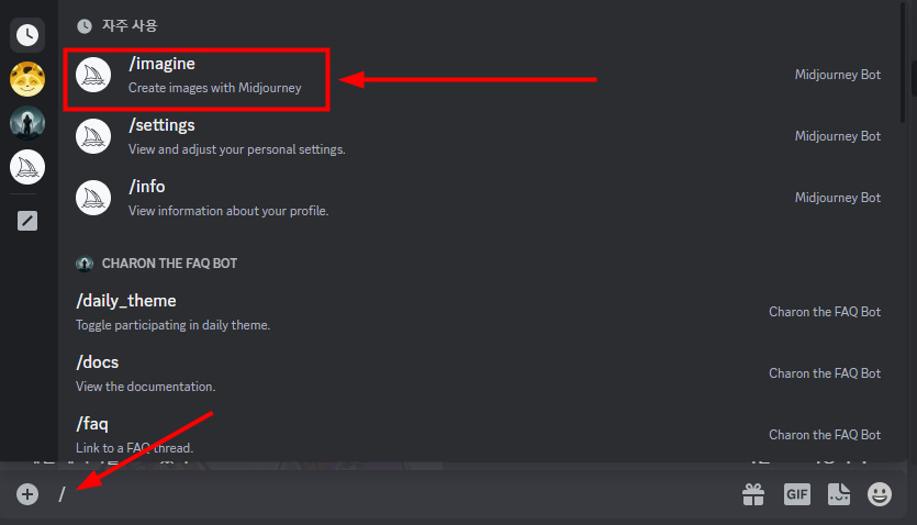 - 하단 채팅창에 /를 치고 기다리면 /imagine라는 시작 명령어가 보입니다. 마우스로 /imagine을 선택하고 내용을 적어 줍니다.