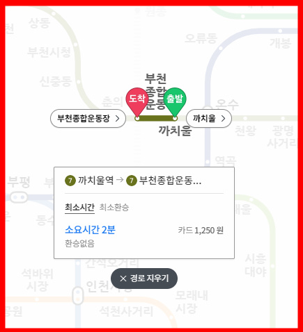 까치울에서 출발, 부천종합운동장역 하차. 총 소요시간 2분, 지하철 요금 카드기준 1,250원입니다.