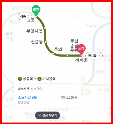 상동역에서 출발, 까치울역 하차. 총 소요시간 9분, 지하철 요금 카드기준 1,250원입니다.
