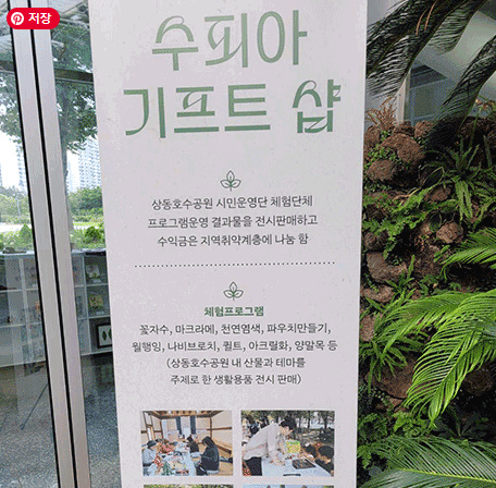 기프트샵 - 상동호수공원 시민운영단에서 체험프로그램을 운영하여 그 결과물을 전시판매하여 수익금은 지역 취약층에 나눔을 하고 있습니다. (상동호수공원 산물과 테마를 주제로 한 생활용품제작, 전시판매)
