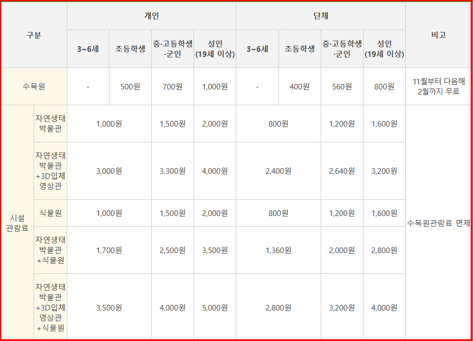 (유료 입장인원 20명당 인솔자 1인, 어린이집 또는 유치원의 경우 10명당 인솔자 1명은 무료로 입장한다.)