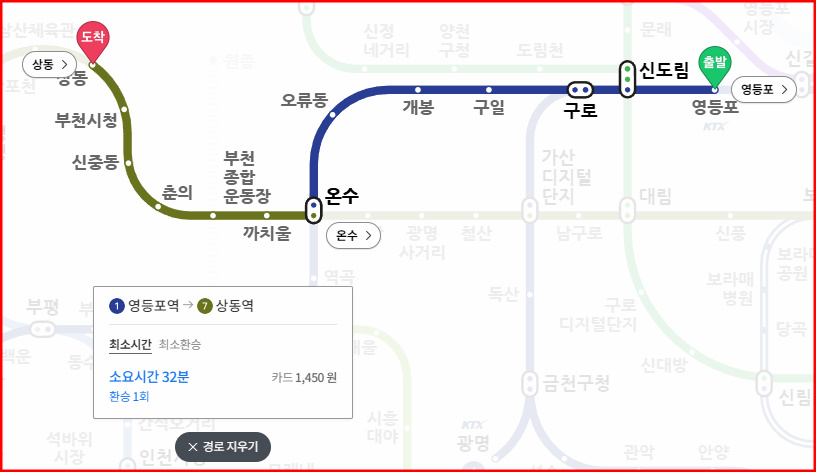 영등포역에서 출발, 온수역에서 7호선 환승후 상동역 하차. 총 소요시간 32분, 지하철 요금 카드기준 1,450원입니다.