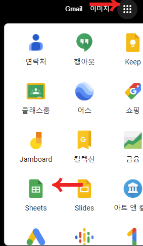 2. 우측 상단 앱 아이콘을 눌러 Sheet 아이콘을 클릭합니다.