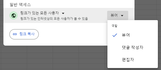 6. 오른쪽 권한 설정에서 편집자 선택합니다. (뷰어, 댓글 작성자, 편집 등)