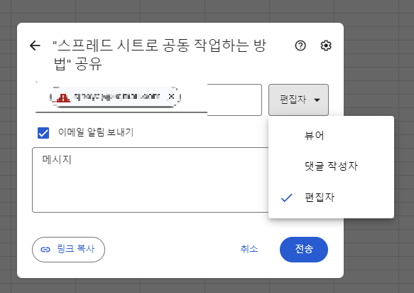 구글 스프레드시트 이메일을 이용한 공유 방법