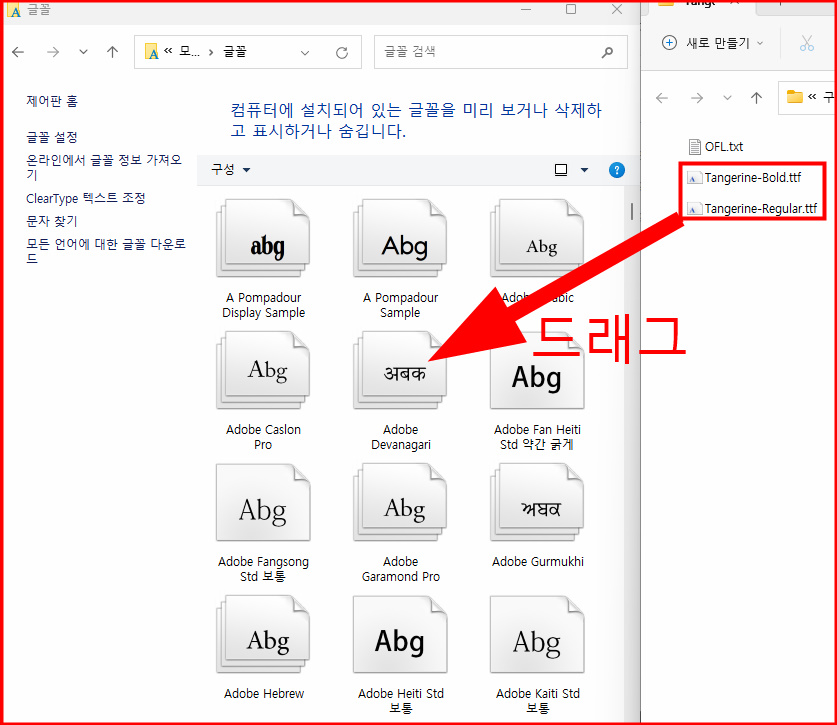 글꼴을 선택해서 들어가 주세요. 이제 설치할 폰트가 있는 폴더에서 원하는 폰트들을 모두 선택한 후 조금 전에 열어 두었던 글꼴폴더에 드래그&드롭을 해주세요. 하나씩 하셔도 되지만 동시에 여러 개 파일을 잡고 옮겨 주시면 한 번에 설치 가능합니다.