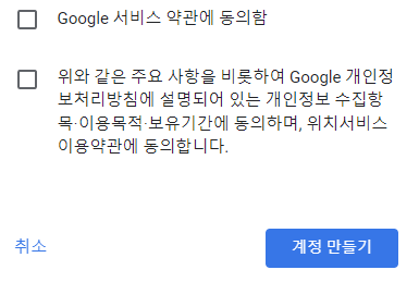 7.서비스 약관 내용이 나오고 하단 동의 박스 체크 후 계정 만들기 버튼을 클릭합니다.