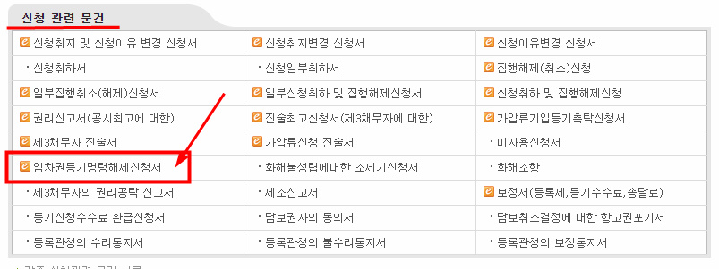 서류제출 >> 민사서류 >> 민사신청 탭 , 웹페이지 하단 신청 관련 문건 중 임차권등기명령해제신청서 양식 을 다운로드하여 작성 후 신청 하시면 됩니다.