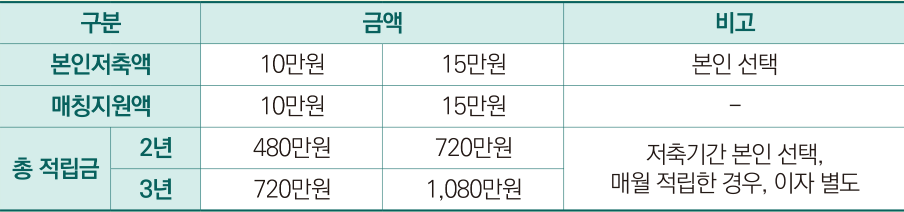 - 본인저축액: 월 10만원 또는 월 15만원 중 선택